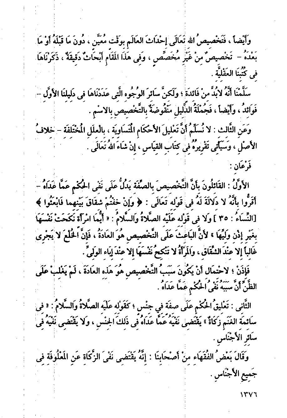 الأول: القائلون بأن التخصيص بالصفة يدل على نفي الحكم عما عداه أقروا بأنه لا دلالة له في قوله تعالى: (وإن خفتم شقاق بينهما فابعثوا) [آلنساء:35] ولا في قوله عليه الصلاة والسلام: (أيما امرأة نكحت نفسها بغير إذن وليها) لأن الباعث علي التخصيص هو العادة فإن الخلع لا يجري غالبا إلا عند الشقاق والمرأة لا تنكح نفسها إلا عند إباء الولي.