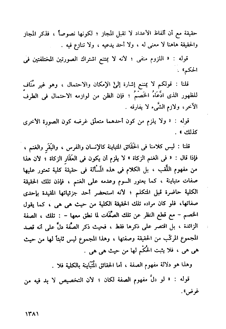 قلنا: ليس كلامنا في الحقائق المتباينة كالإنسان والفرس، والبقر والغنم، فإذا قال: (في الغنم الزكاة) لا يلزم أن يكون في العقار الزكاة؛ لأن هذا من مفهوم اللقب، بل الكلام في هذه المسألة في حقيقة كلية تعتور عليها صفات متباينة، كما يعتور السوم وعدمه على الغنم، فإذن تلك الحقيقة الكلية حاضرة قبل المتلكم؛ لأنه استحضر أحد جزئياتها المقيدة بإحدى صفاتها، فلو كان مراده تلك الحقيقة الكلية من حيث هي هي، كما يقول الخصم مع قطع النظر عن تلك الصفات لما نطق معها: تلك، الصفة الزائدة، بل اقتصر على ذكرها فقط، فحيث ذكر الصفة دل على زنه قصد المجموع المركب من الحقيقة وصفتها، وهذا المجموع ليس ثابتا لها من حيث هي هي، فلا يثبت الحكم لها من حيث هي هي.