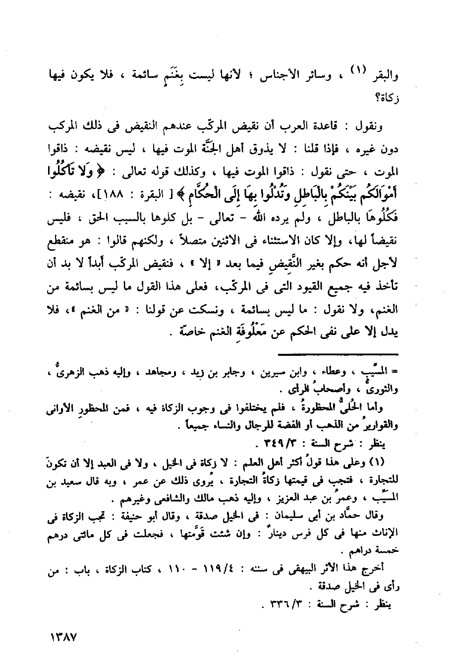 ونقول: قاعدة العرب أن نقيض المركب عندهم النقيض في ذلك المركب دون غيره، فإذا قلنا: لا يذوق أهل الجنة الموت فيها، ليس نقيضه: ذاقوا الموت، حتى نقول: ذاقوا الموت فيها، وكذلك قوله تعالى: (ولا تأكلوا أموالكم بينكم بالباطل وتدلوا بها إلى الحكام) [البقرة:188] نقيضه: فكلوها بالباطل ولم يرد الله تعالى بل كلوها بالسبب الحق، فليس نقيضا لها وإلا كان الاستثناء في الاثنين متصلا، ولكنهم قالوا: هو منقطع لأجل أنه حكم بغير النقيض فيما بعد (إلا)، فنقيض المركب أبدا لا بد أن تأخذ فيه جميع القيود التي في المركب فعلى هذا القول ما ليس بسائمة من الغنم ولا نقول: ماليس بسائمة، ونسكت عن قولنا: (من الغنم) فلا يدل إلا على نفي الحكم عن معلوفة الغنم خاصة.