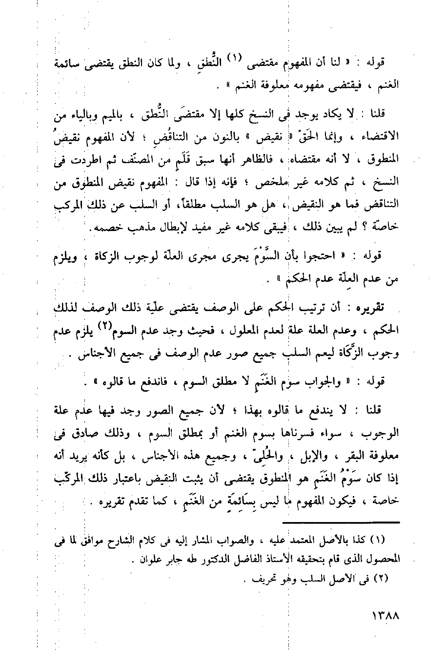 قلنا: لا يندفع ماقالوه بهذا، لأن جميع الصور وجد فيها عدم علة الوجوب، سواد فسرناها بسوم الغنم أو بمطلق السوم، وذلك صادق في معلوفة البقر، والإبل والحلى وجميع هذا الأجناس، بل كأنه يريد أنه إذا كان سوم الغنم هو المنطوق يقتضي أن يثبت النقيض باعتبار ذلك المركب خاصة، فيكون المفهوم ما ليس بسائمة من الغنم، كما تقدم تقريره.