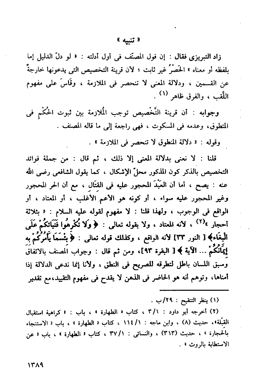 زاد التبريزي فقال: إن قول المصنف في أول أدلته: (لو دل الدليل إما بلفظه أو معناه) الحصر غير ثابت، لأن قرينة التخصيص التي يدعونها خارجة عن القسمين، ودلالة المعنى لا تنحصر في الملازمة، وقاس على مفهوم اللقب، والفرق ظاهر.