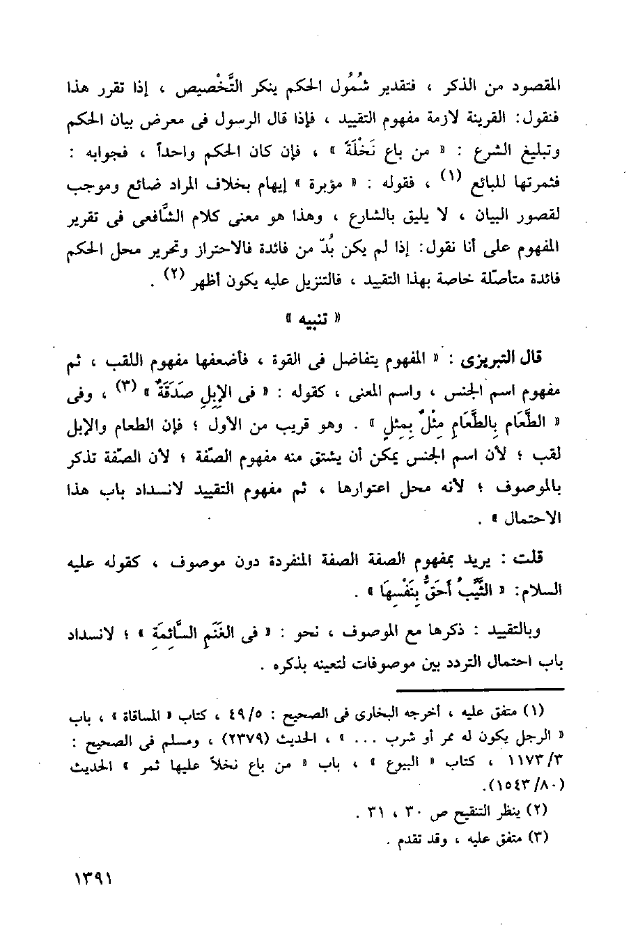 المقصود من الذكر، فتقدير شمول الحكم ينكر التخصيص، إذا تقرر هذا فنقول: القرينة لازمة مفهوم التقييد، فإذا قال الرسول في معرض بيان الحكم وتبليغ الشرع: (من باع نخلة)، فإن كان الحكم واحدا، فجوابه: فثمرتها للبائع، فقوله: (مؤبرة) إبهام بخلاف المراد ضائع وموجب لقصور البيان، لا يليق بالشارع وهذا هو معنى كلام الشافعي في تقرير المفهوم على أن نقول: إذا لم يكن بد من فائدة فالاحتراز وتحرير محل الحكم فائدة متأصلة خاصة بهذا التقييد، فالتنزيل عليه يكون أظهر.