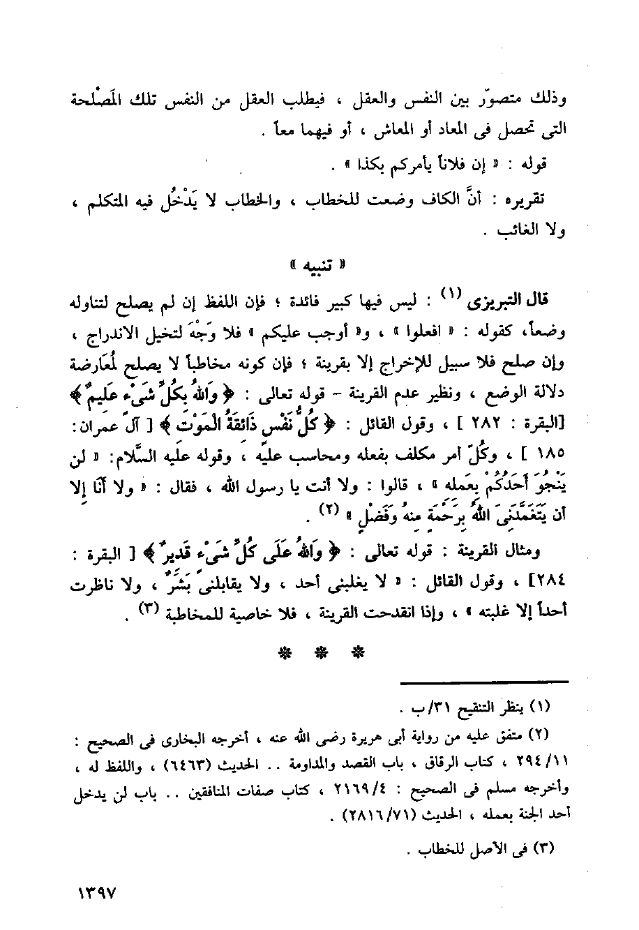 قال التبريزي ليس فيها كبير فائدة، فإن اللفظ إن لم يصلح لتناوله وضعا كقوله: (افعلوا) و (أوجب عليكم) فلا وجه لتخيل الاندراج وإن صلح فلا سبيل للإخراج إلا بقرينة، فإن كونه مخاطبا لا يصلح لمعارضة دلالة الوضع، ونظير عدم القرينة قوله تعالى: (والله بكل شيء عليم) [البقرة:282] وقول القائل: (كل نفس ذائقة الموت) [آل عمران:185]، وكل أمر مكلف بفعله ومحاسب عليه، وقوله عليه السلام: (لن ينجو أحدكم بعمله) قالوا: ولا أنت يا رسول الله، فقال: (ولا أنا إلا أن يتغمدني الله برحمة منه وفضل)