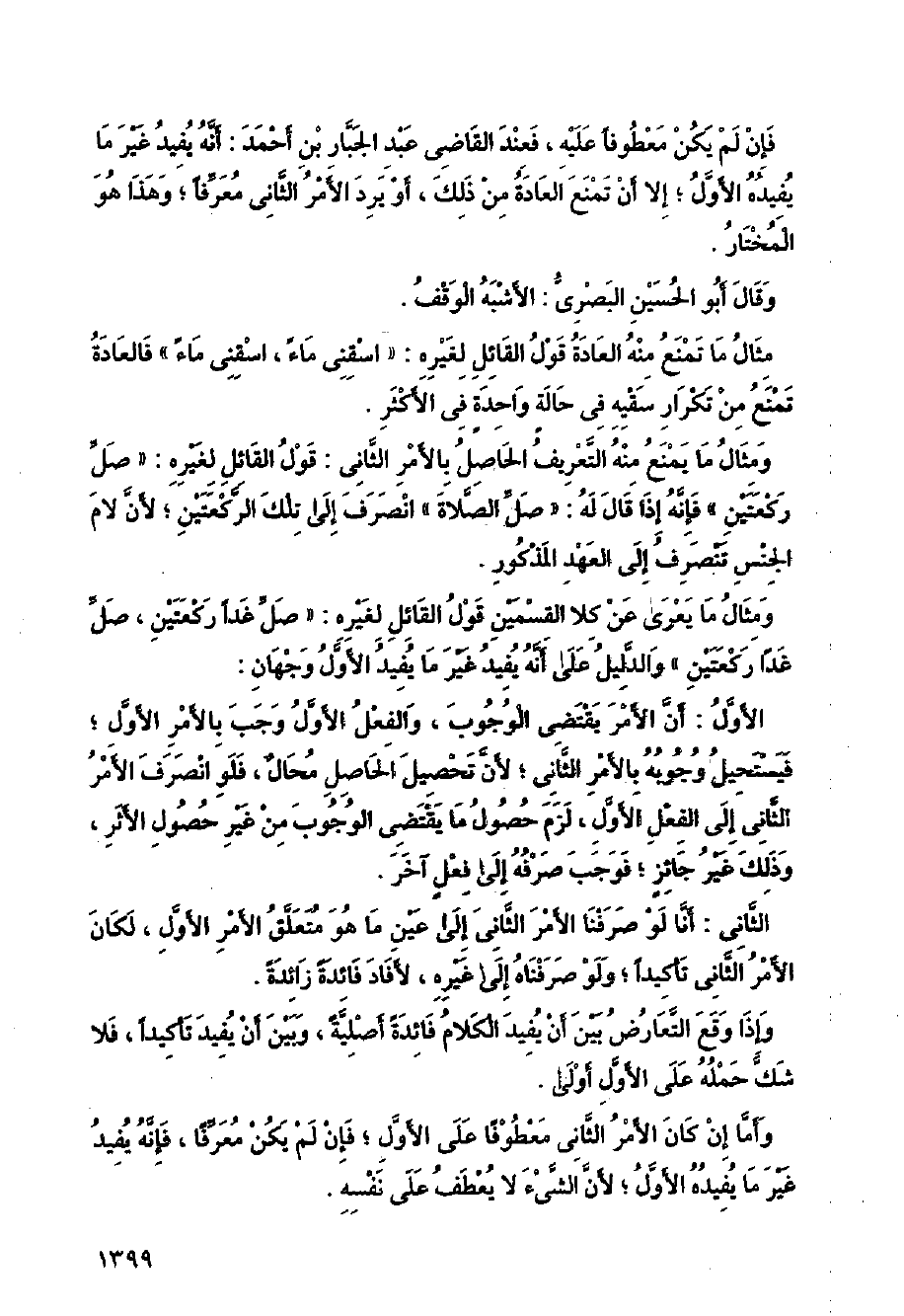 فإن لم يكن معطوفا عليه فعند القاضي عبدالجبار بن أحمد: أنه يفيد غير ما يفيده الأول: إلا أن تمنع العادة من ذلك، أو يرد الأمر الثاني معرفا، وهذا هو المختار