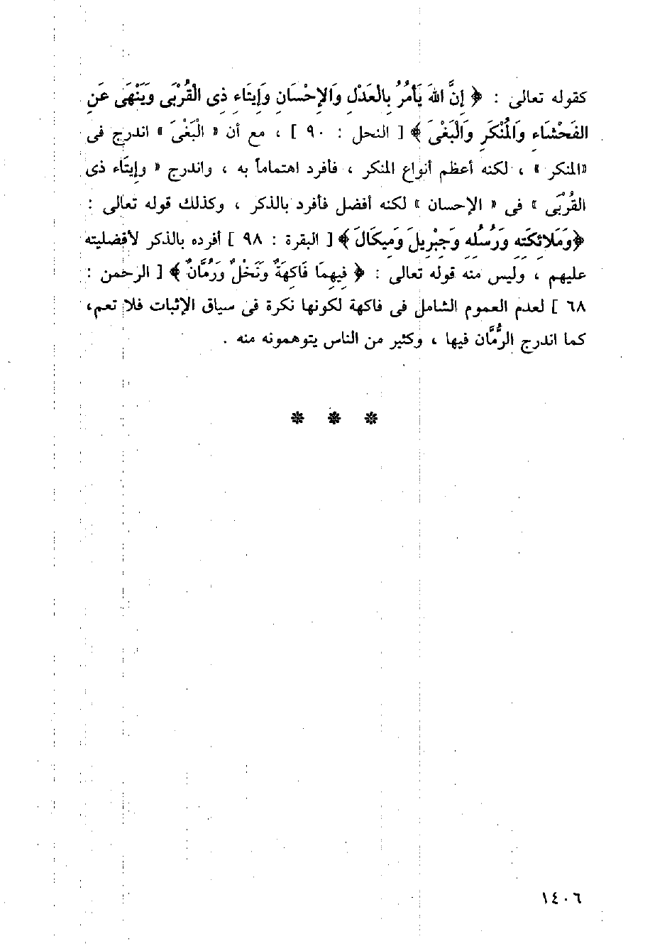 كقوله تعالى: (إن الله يأمر بالعدل والإحسان وإيتاء ذي القربى وينهى عن الفحشاء والمنكر والبغي) [النحل:90]، ومع أن (البغي) اندرج في (المنكر)، لكنه أعظم أنواع المنكر، فأفرد اهتماما به، واندرج (وإيتاء ذي القربى) في (الإحسان) لكنه أفضل فأفرد بالذكر، وكذلك قوله تعالى: (وملائكته ورسله وجبريل وميكال) [البقرة:98] أفرد بالذكر لأفضليته عليهم، وليس منه قوله تعالى: (فيها فاكهة ونخل ورمان) [الرحمن:68] لعدم العموم الشامل في فاكهة لكونها نكرة في سياق الإثبات فلا تعم، كما اندرج الرمان فيها، وكثير من الناس يتوهمونه منه.
