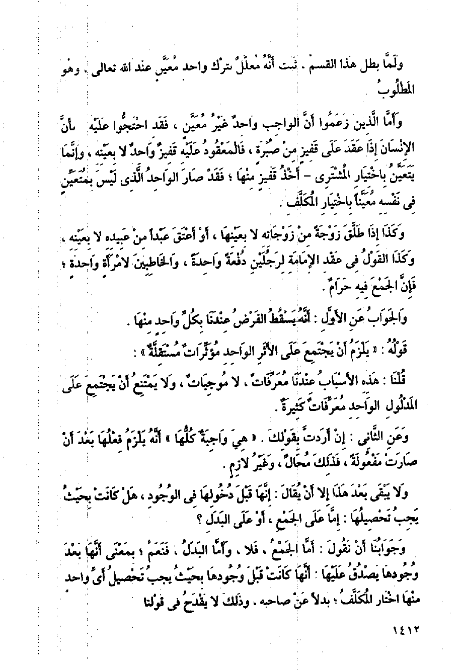 وأما الذين زعموا أن الواجب واحد غير معين، فقد احتجوا عليه، بأن الإنسان إذا عقد على قفيز من صبرة، فالمعقود عليه قفيز واحد لا بعينه، وإنما يتعين باختيار المشتري أخذ قفيز منها، فقد صار الواحد الذي ليس بمتعين في نفسه معينا باختيار المكلف.