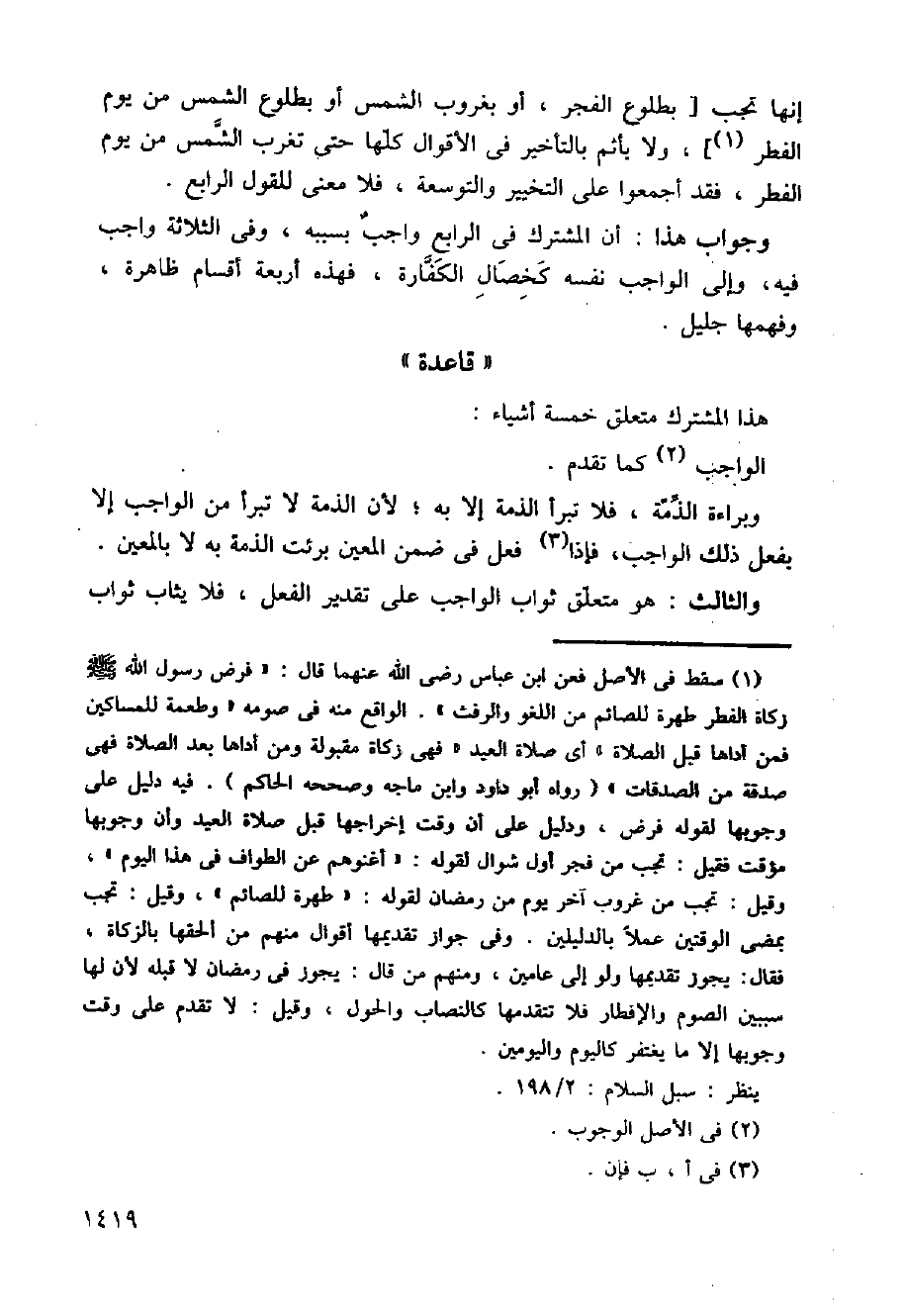 إنها تجب [بطلوع الفجر، أو بغروب الشمس أو بطلوع الشمس من يوم الفطر]، ولا يأثم بالتأخير في الأقوال كلها حتى تغرب الشمس من يوم الفطر، فقد أجمعوا على التخيير والتوسعة، فلا معنى للقول الرابع.