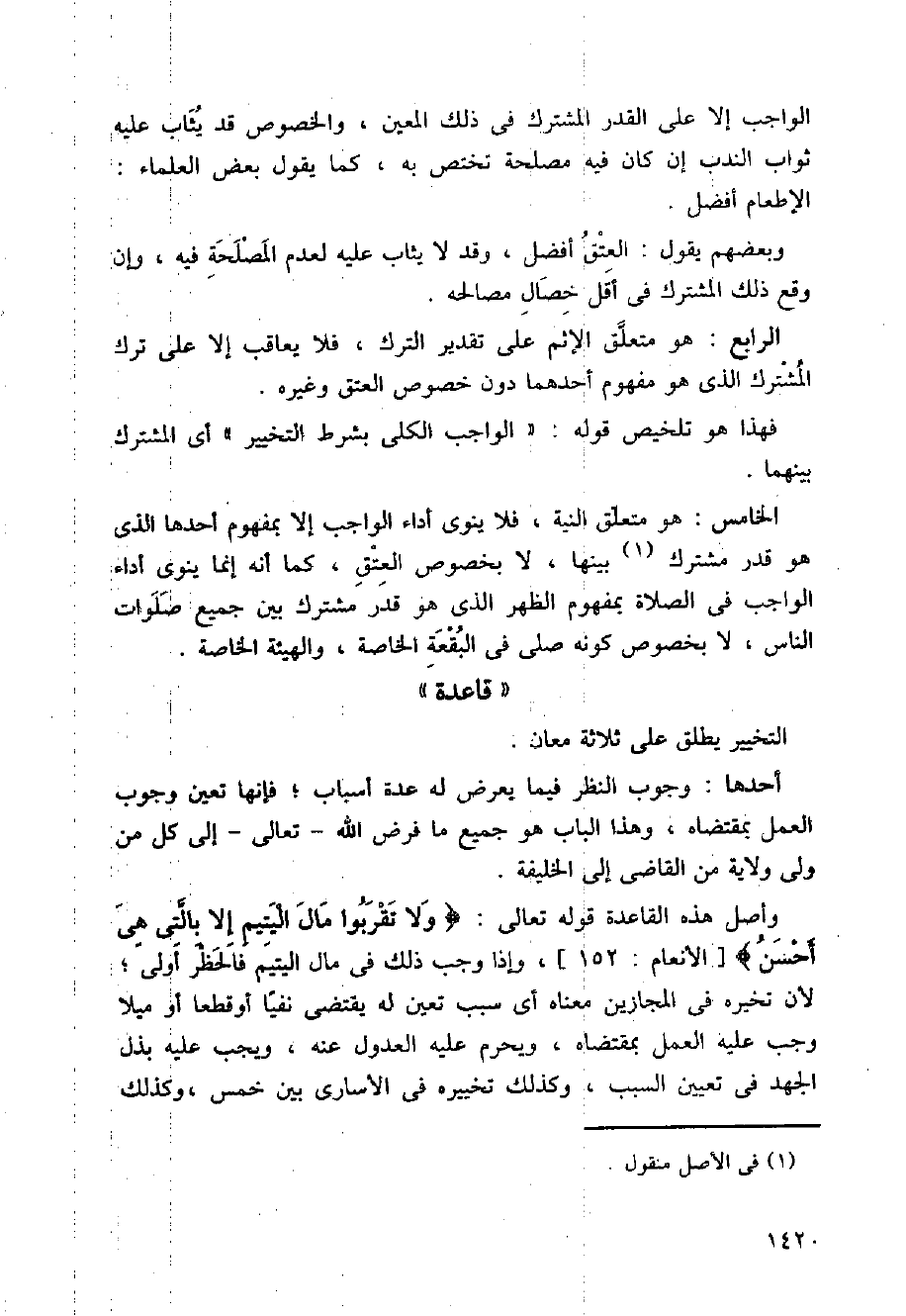 وأصل هذه القاعدة قوله تعالى: (ولا تقربوا مال اليتيم إلا بالتي هي أحسن) [الأنعام:152]، وإذا وجب ذلك في مال اليتيم فالحظر أولى لأن تخيره في المجازين معناه أي سبب تعين له يقتضي نفيا أو قطعا أو ميلا وجب عليه العمل بمقتضاه، ويحرم عليه العدول عنه، ويجب عليه بذل الجهد في تعيين السبب، وكذلك تخييره في الأسارى بين خمس، وكذلك