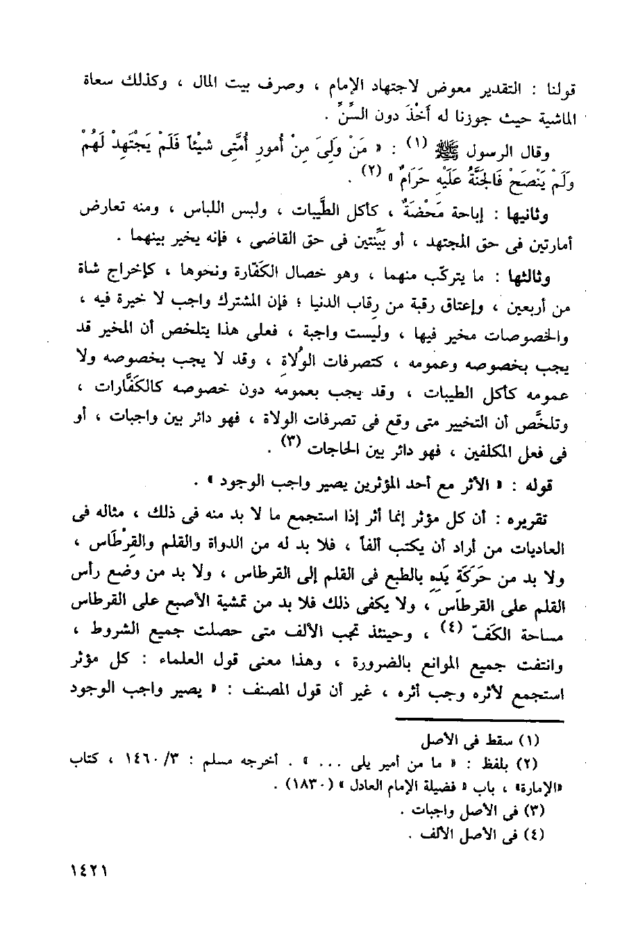 وثالثها: ما يتركب منهما، وهو خصال الكفارة ونحوها، كإخراج شاة من زربعين، ورعتقا رقبة من رقاب الدنيا؛ فإن المشترك واجب لا خيرة فيه، والخصوصات مخير فيها، وليست واجبة، فعلى هذا يتلخص أن المخير قد يوجب بخصوصه مخير فيها، وليست واجبة، فعلى هذا يتلخص أن المخير قد يجب بخصوصه وعمومه، كتصرفات الولاة. وقد لا يجب بخصوصه ولا عمومه كأكل الطيبات، وقد يجب بعمومه دون خصوصه كالكفارات، وتلخص أن التخيير متى وقع في تصرفات الولاة، فهو دائر بين واجبات، أو في فعل المكلفين، فهو دائر بين الحاجات.