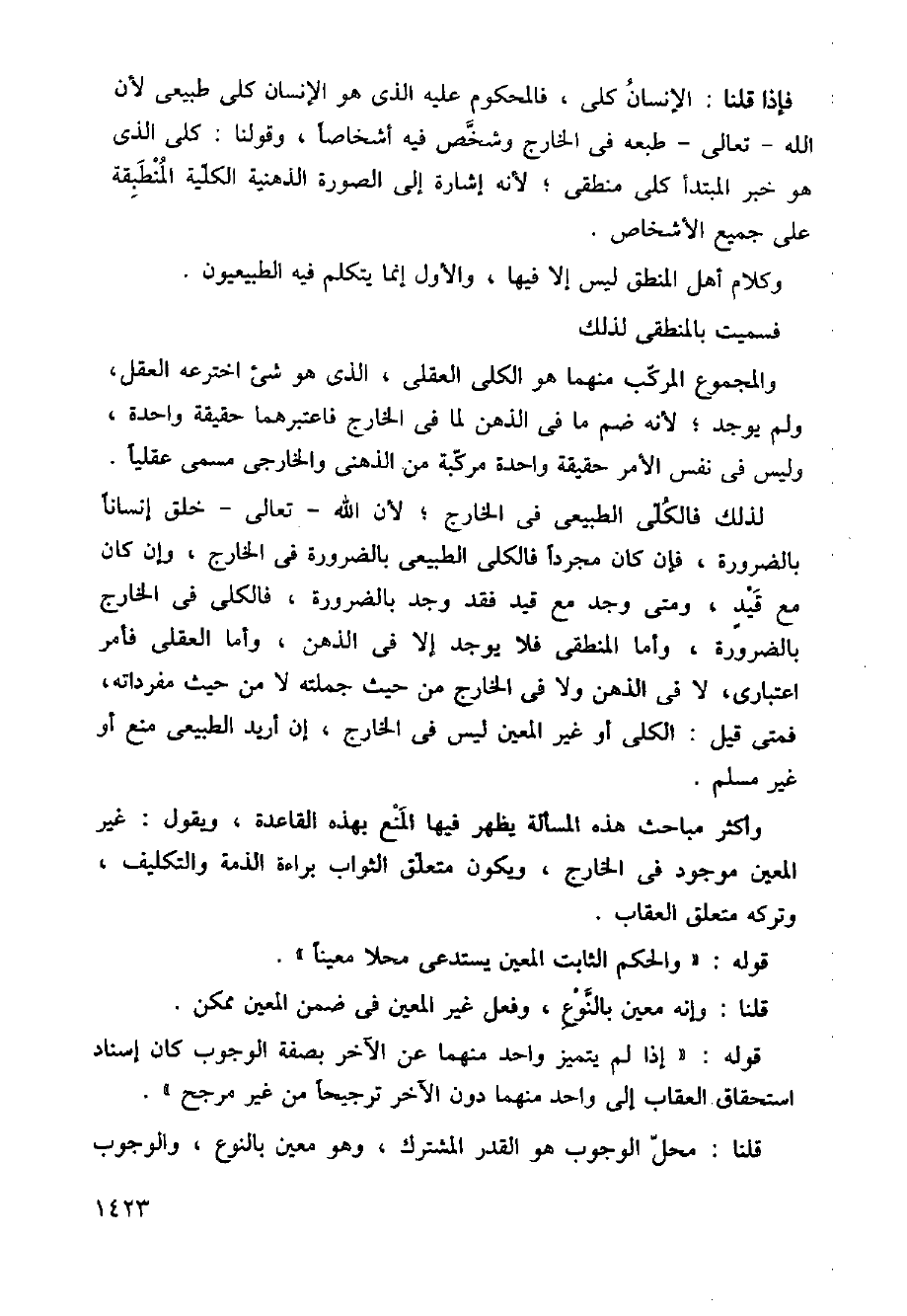 لذلك فالكلي الطبيعي في الخارج؛ لأن الله تعالى خلق إنسانا بالضرورة، فإن كان مجردا فالكلي الطبيعي بالضرورة في الخارج، وإن كان مع قيد، ومتى وجد مع قيد وجد بالضرورة، فالكلي في الخارج بالضرورة، وأما المنطقي فلا يوجد إلا في الذهن، وأما العقلي فأمر اعتباري، لا في الذهن ولا في الخارج من حيث جملته لا من حيث مفرداته، فمتى قيل: الكلي أو غير المعين ليس في الخارج، إن أريد الطبيعي منع أو غير مسلم.