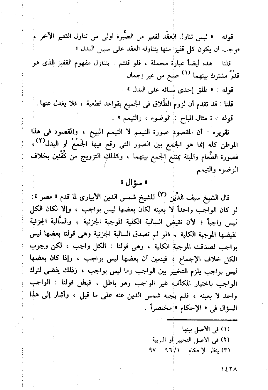 قال الشيخ سيف الدين: للشيخ شمس الدين الأبياري لما قدم (مصر): لو كان الواجب واجدا لا بعينه لكان بعضها ليس بواجب، وإلا لكان الكل ليس واجبا؛ لأن نقيض السالبة الكلية الموجبة الجزئية، والسالبة الجزئية نقيضها الموجبة الكلية، فلو لم تصدق السالبة الجزئية وهي قولنا بعضها ليس بواجب لصدقت الموجبة الكلية، وهي قولنا: الكل واجب، لكن وجوب الكل خلاف الإجماع، فيتعين أن بعضها ليس بواجب، وإذا كان بعضها ليس بواجب يلزم التخيير بين الواجب وماليس بواجب، وذلك يفضي لترك الواجب باختيار الملكف غير الواجب وهو باطل، فبطل قولنا: الواجب واحد لا بعينه، فلم يجبه شمس الدين عنه على ما قيل، وأشار إلى هذا السؤال في (الإحكام) مختصراً.