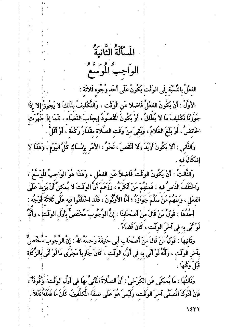 والثالث: أن يكون الوقت فاضلا عن الفعل، وهذا هو الواجب الموسع واختلف الناس فيه: فمنهم من أنكره، وزعم أن الوقت لا يمكن أن يزيد على الفعل ومنهم من سلم جوازه أما الأولون فقد اختلفوا فيه على ثلاث أوجه: أحدها: قول من قال من أصحابنها: إن الوجوب مختص بأول الوقت، وأنه وأتى به في آخر الوقت، كان قضاء.