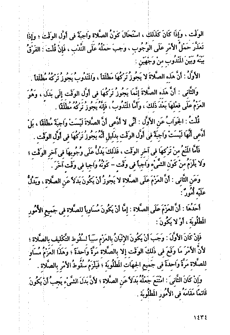 فإن كان الأول: وجب أن يكون الإتيان بالعزم سببا لسقوط التكليف بالصلاة؛ لأن الأمر ما وقع في ذلك الوقت إلا بالصلاة مرة واحدة، وهذا العزم مساو للصلاة مرة واحدة في جميع الجهات المطلوبة؛ فيلزم سقوط الأمر بالصلاة.