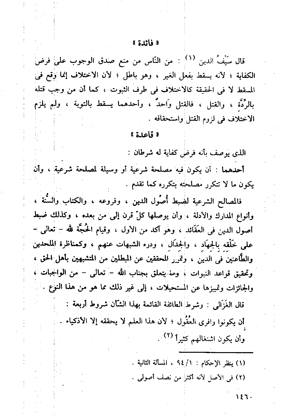 قال سيف الدين: من الناس من منع صدق الوجوب على فرض الكفاية؛ لأنه يسقط بفعل الغير، وهو باطل؛ لأن الاختلاف إنما وقع في المسقط لا في الحقيقة كالاختلاف في طرف الثبوت، كما أن من وجب قتله بالردة، والقتل، فالقتل واحد، وأحدهما يسقط بالتوبة، ولم يلزم الاختلاف في لزوم القتل واستحقاقه.