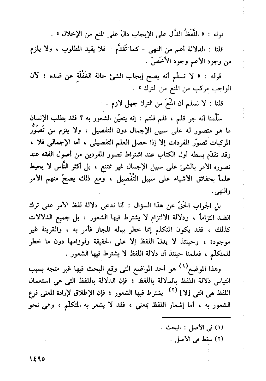 سلمنا أنه جر قلم، فلم قلتم: إنه يتعين الشعور به؟ فقد يطلب الإنسان ماهو متصور له على سبيل الإجمال دون التفصيل، ولا يلزم من تصور المركبات تصور المفردات إلا إذا حصل العلم التفصيلي، أما الإجمالي فلا، وقد تقدم بسطه أول الكتاب عند إشتراط تصور المفردين من أصول الفقه عند تصوره الأمر بالشيء على سبيل الإجمال غير ممتنع، بل أكثر الناس لايحيط علما بحقائق الأشياء على سبيل التفصيل، ومع ذلك يصح منهم الأمر والنهي.