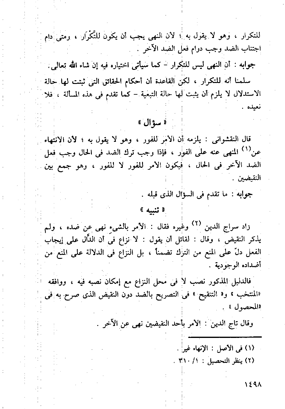 وقال تاج الدين: الأمر بأحد النقيضين نهى عن الآخر.