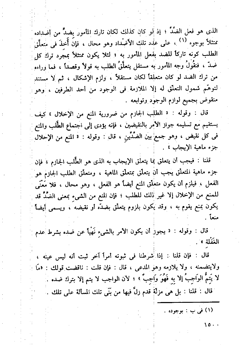 قلنا: فيجب أن يتعلق بما يتعلق الإيجاب به الذي هو الطلب الجازم؛ فإن جزء ماهية المتعلق يجب أن يتعلق بمتعلق الماهية، ومتعلق الطلب الجازم هو الفعل، فيلزم أن يكون متعلق المنع أيضا هو الفعل، وهو محال، فلا معنى للمنع من الإخلال إلا غير ذلك للطلب؛ فإن المنع من الشيء بمعنى الضد قد يكون بمنع يقوم به، وقد يكون بلزوم يتعلق بضده أو نقضيه، ويسمى أيضا منعا.