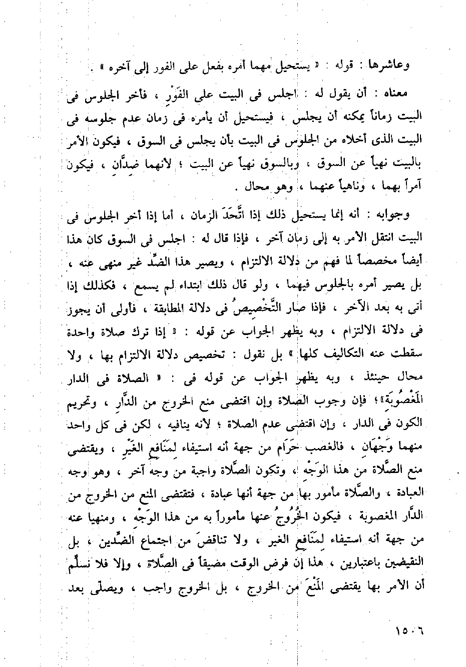 وجوابه: أنه إنما يستحيل ذلك إذا اتحد الزمان، أما إذا أخر الجلوس في البيت انتقل الأمر به إلى زمان آخر، فإذا قال له: اجلس في السوق كان هذا أيضاً مخصصاً لما فهم من دلالة الالتزام، ويصير هذا الضد غير منهي عنه، بل يصير أمره بالجلوس فيهما، ولو قال ذلك ابتداء لم يسمع، فكذلك إذا أتى به بعد الآخر، فإذا صار التخصيص في دلالة المطابقة، فأولى أن يجوز في دلالة الالتزام، وبه يظهر الجواب عن قوله: "إذا ترك صلاة واحدة سقطت عنه التكاليف كلها"