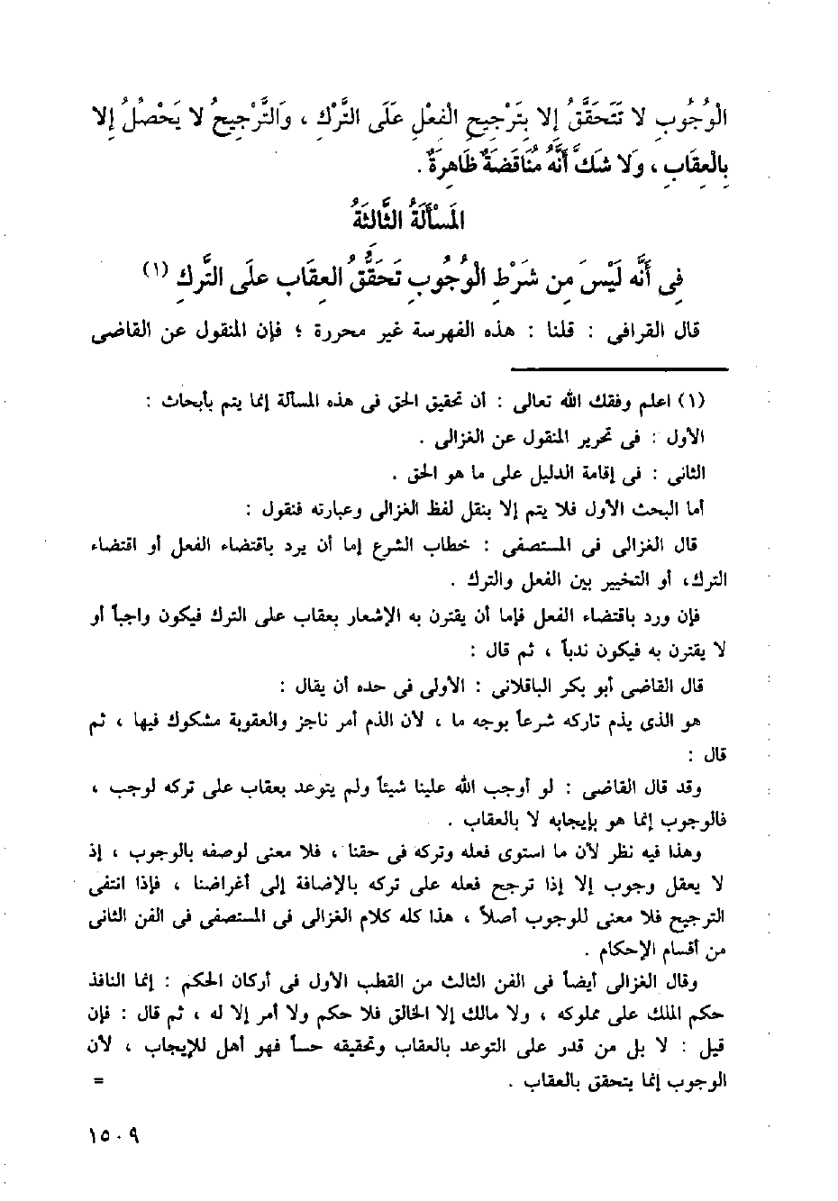 قال القرافي: قلنا: هذه الفهرسة غير محررة؛ فإن المنقول عن القاضي