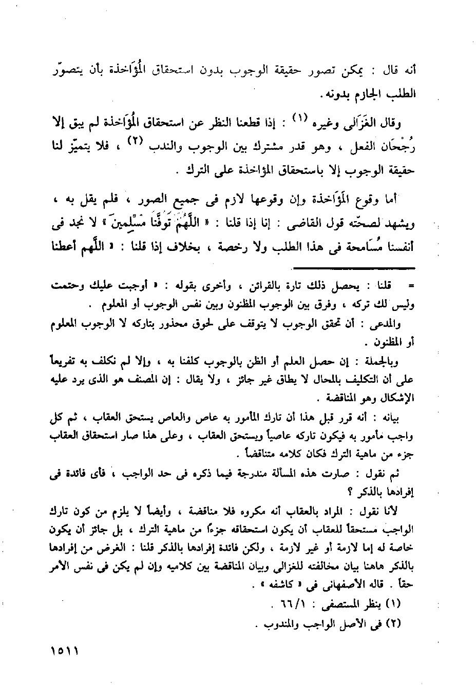 أنه قال: يمكن تصور حقيقة الوجوب بدون إستحقاق المؤاخذة بأن يتصور الطلب الجازم بدونه.