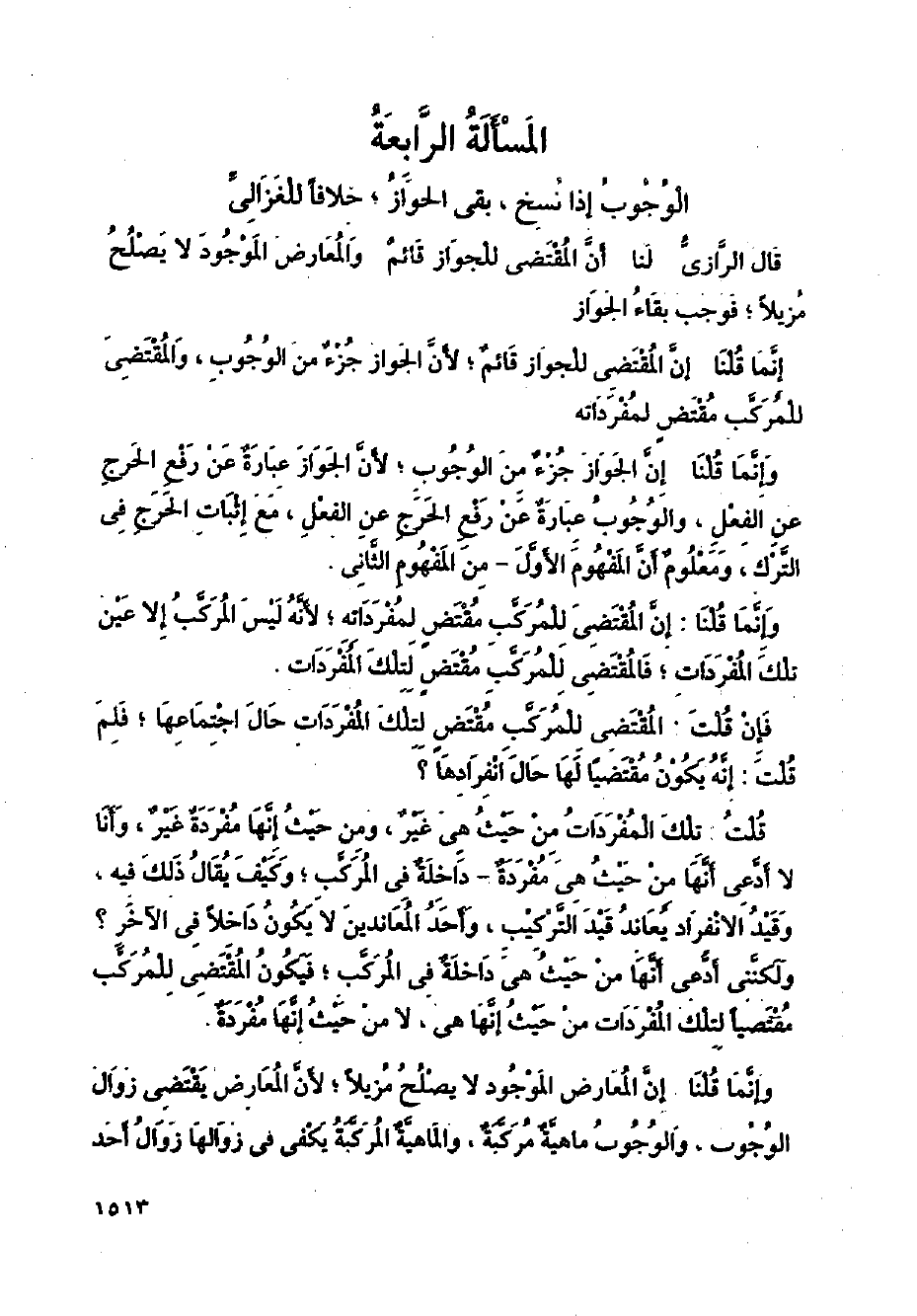 وإنما قلنا إن المعارض الموجود لا يصلح مزيلاً؛ لأن المعارض يقتضي زوال الوجوب، والوجوب ماهية مركبة، والماهية المركبة يكفي في زوالها زوال أحد