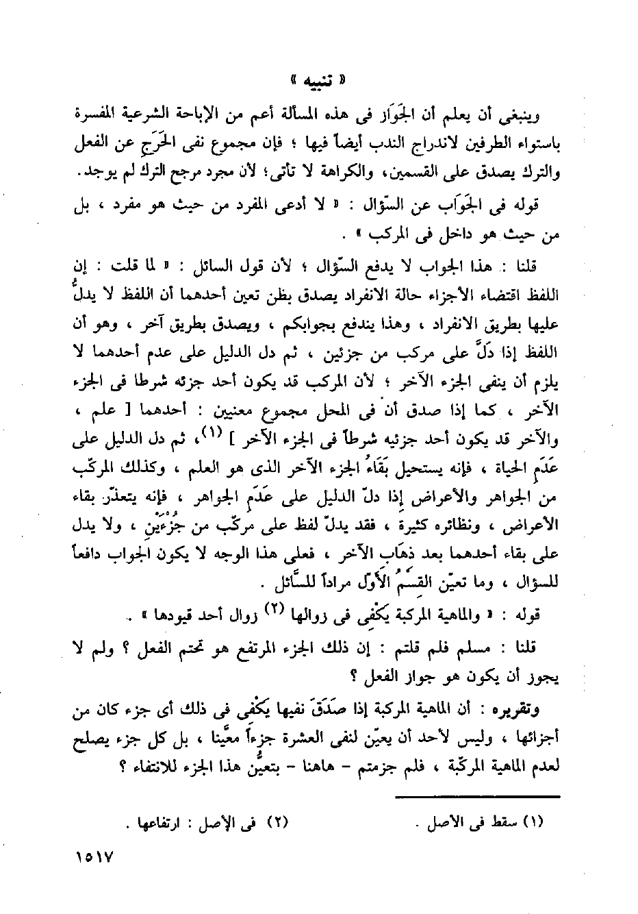 قلنا: هذا الجواب لا يدفع السؤال؛ لأن قول السائل: " لما قلت: إن اللفظ اقتضاء الأجزاء حالة الانفراد يصدق بظن تعين أحدهما أن اللفظ لا يدل عليها بطريق الانفراد، وهذا يندفع بجوابكم، ويصدق بطريق آخر، وهو أن اللفظ إذا دل على مركب من جزئين، ثم دل الدليل على عدم أحدهما لا يلزم أن ينفي الجزء الآخر؛ لأن المركب قد يكون أحد جزئه شرطا في الجزء الآخر، كما إذا صدق أن في المحل مجموع معنيين: أحدهما علم، والآخر قد يكون أحد جزئيه شرطاً في الجزء الآخر، ثم دل الدليل على عدم الحياة، فإنه يستحيل بقاء الجزء الآخر الذي هو العلم، وكذلك المركب من الجواهر والأعراض إذا دل الدليل على عدم الجواهر، فإنه يتعذر بقاء الأعراض، ونظائره كثيرة، فقد يدل لفظ على مركب من جزءين، ولا يدل على بقاء أحدهما بعد ذهاب الآخر، فعلى هذا الوجه لا يكون الجواب دافعاً للسؤال، وما تعين القسم الأول مراداً للسائل.