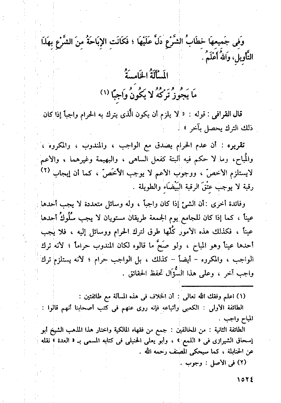 وفائدة أخرى: أن الشيء إذا كان واجباً، وله وسائل متعددة لا يجب أحدها عينا، كما إذا كان للجامع يوم الجمعة طريقان مستويان لا يجب سلوك أحدهما عينا، فكذلك هذه الأمور كلها طرق لترك الحرام ووسائل إليه، فلا يجب أحدها عينا وهو المباح، ولو صح ما قالوه لكان المندوب حراما؛ لأنه ترك الواجب، والمكروه أيضاً كذلك، بل الواجب حرام؛ لأنه يستلزم ترك واجب آخر، وعلى هذا السؤال تحفظ الحقائق.