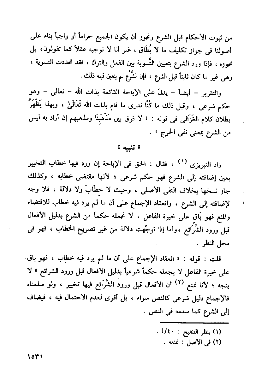 زاد التبريزي، فقال: الحق في الإباحة إن ورد فيها خطاب التخيير بعين إضافته إلى الشرع فهو حكم شرعي؛ لأنها مقتضى خطابه، وكذلك جاز نسخها بخلاف النفي الأصلي وحيث لا خطاب ولا دلالة، فلا وجه لإضافته إلى الشرع، وانعقاد الإجماع على أن ما لم يرد فيه خطاب للاقتضاء والمنع فهو باق على خيرة الفاعل، لا نجعله حكما من الشرع بدليل الأفعال قبل ورود الشرائع، وأما إذا توجهت دلالة من غير تصريح الخطاب، فهو في محل النظر.
