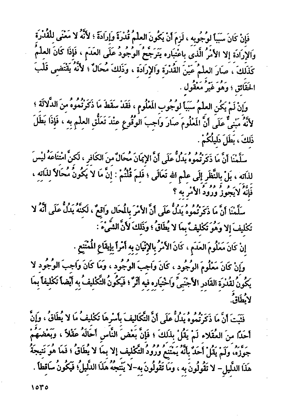 فثبت أن ما ذكرتموه يدل على أن التكاليف بأسرها تكليف ما لا يطاق، وان أحدا من العقلاء لم يقل بذلك؛ فإن بعض الناس أحاله عقلا، وبعضهم جوزه، ولم يقل أحد بانه يمتنع ورود التكليف الا بما لا يطاق؛ فما هو نتيجة هذا الدليل - لا تقولون به، وما تقولون به - لا ينتجه هذا الدليل؛ فيكون ساقطاً.