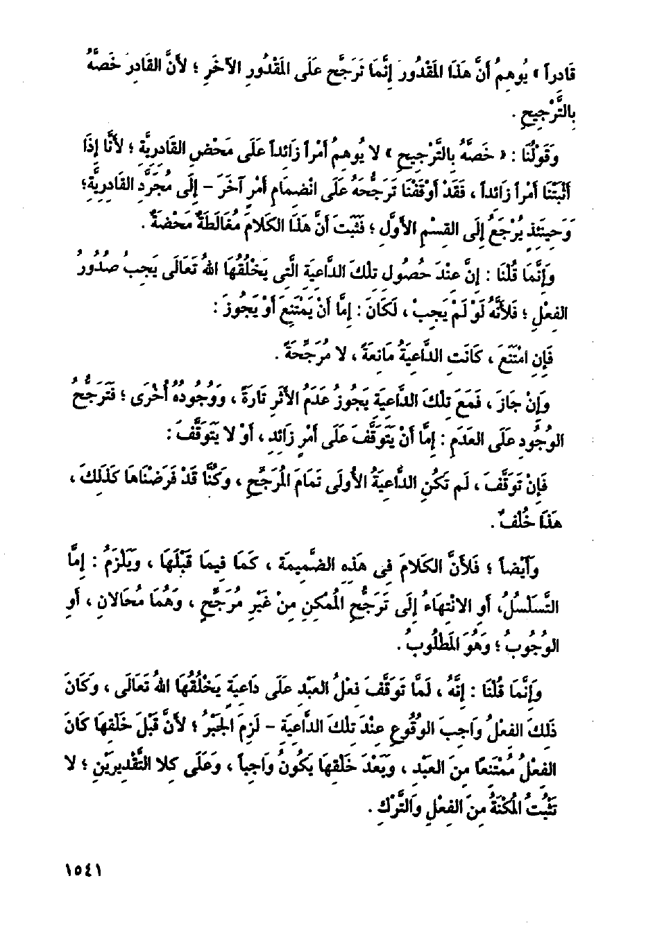 وقولنا: "خصه بالترجيح" لا يوهم أمرًا زائدًا على محض القادرية؛ لأنا إذا أثبتنا أمرًا زائدًا، فقد أوقفنا ترجحه على انضمام أمر آخر إلى مجرد القادرية؛ وحينئذ يرجع إلى القسم الأول؛ فثبت أن هذا الكلام مغالطة محضة.