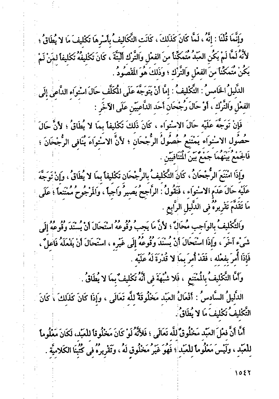 الدليل الخامس: التكليف: إما أن يتوجه على المكلف حال استواء الداعي إلى الفعل والترك، أو حال رجحان أحد الداعيين على الآخر: