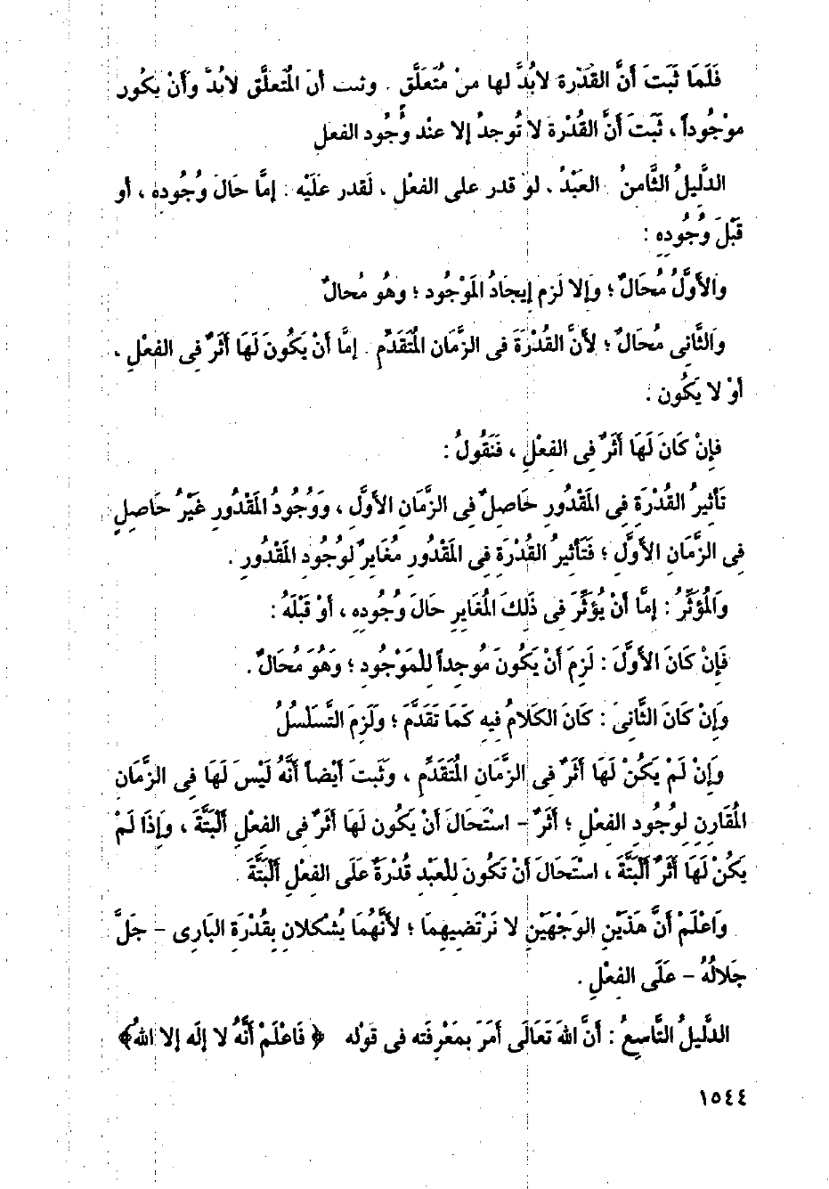 وإن لم يكن لها أثر في الزمان المتقدم، وثبت أيضًا أنه ليس لها في الزمان المقارن لوجود الفعل أثر؛ استحال ان يكون لها أثر في الفعل البتة، وإذا لم يكن لها أثر البتة، استحال ان تكون للعبد قدرة على الفعل البتة.