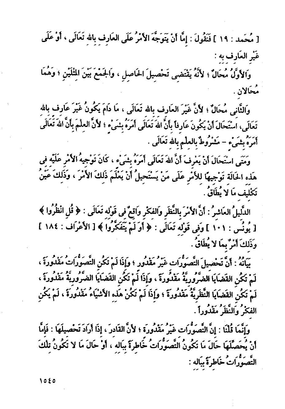 الدليل العاشر: أن الأمر بالنظر والفكر واقع في قوله تعالى: {قل انظروا}] يونس: 101 [وفي قوله تعالى: {أولم يتفكروا}] الأعراف: 184 [وذلك أمر بما لا يطاق.