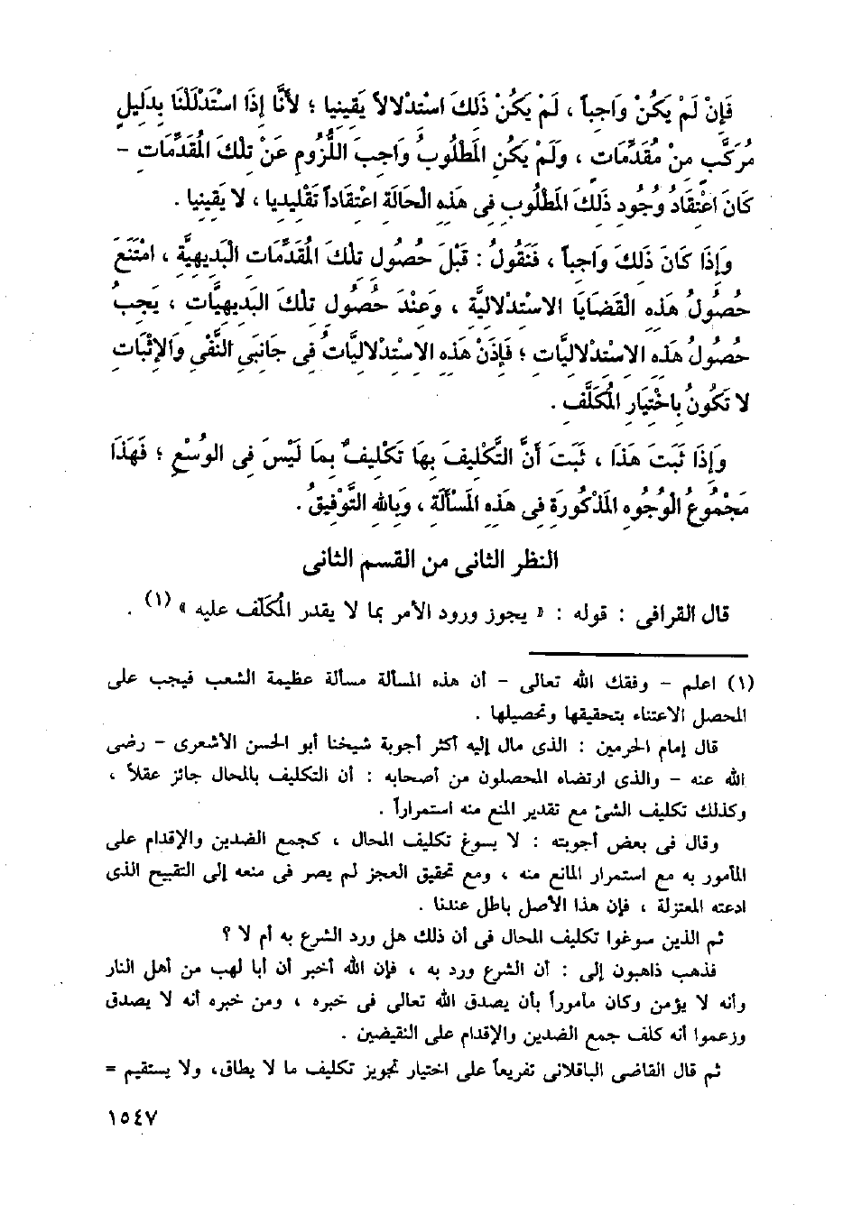 فإن لم يكن واجبًا، لم يكن ذلك استدلالًا يقينيًا؛ لأنّا إذا استدللنا بدليل مركب من مقدمات، ولم يكن المطلوب واجب اللزوم عن تلك المقدمات كان اعتقاد وجود ذلك المطلوب في هذه الحالة اعتقادًا تقليديًا، لا يقينيًا.
