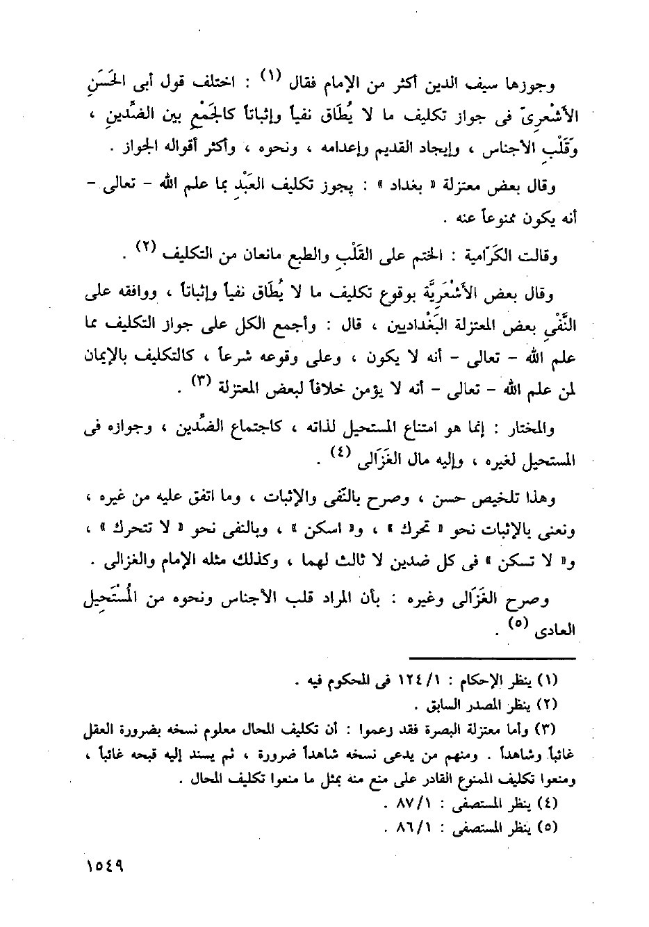وجوزها سيف الدين أكثر من الإمام فقال: اختلف قول أبي الحسن الأشعري في جواز تكليف ما لا يطاق نفيًا وإثباتًا كالجمع بين الضدين، وقلب الأجناس، وإيجاد القديم وإعدامه، ونحوه، وأكثر أقواله الجواز.