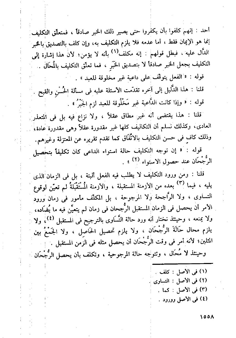 قلنا: ومن ورود التكليف لا يطلب فيه الفعل البتة، بل في الزمان الذي يليه، فيما بعده من الأزمنة المستقبلة، والأزمنة المستقبلة لم تعين لوقوع التساوي، ولا الراجحة ولا المرجوحة، بل المكلف مأمور في زمان ورود الأمر أن يحصل في الزمان المستقبل الرجحان في زمان لم يتعين فيه ما يضاده، ولا يمنعه، وحينئذ نختار أنه ورد حالة التساوي بالترجيح في المستقبل، ولا يلزم محال حالة الرجحان، ولا يلزم تحصيل الحاصل، ولا الجمع بين المثلين؛ لأنه أمر في وقت الرجحان أن يحصل مثله في الزمن المستقبل.