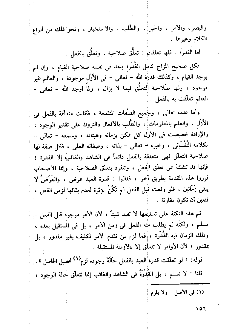وأما علمه تعالى، وجميع الصفات المتقدمة، فكانت متعلقة بالفعل في الأزل، والعلم بالمعلومات، والطلب بالأفعال والتروك على تقدير الوجود، والإرادة خصصت في الأزل كل ممكن زمانه وهيئاته، وسمعه تعالى بكلامه النفساني، وخبره تعالى بذاته، وصفاته العلى، فكل صفة لها صلاحية التعلق فهي متعلقة بالفعل دائما في الشاهد والغائب إلا القدرة؛ فإنها قد تنفك عن تعلق الفعل، وتنفرد بتعلق الصلاحية، وإنما الأصحاب قرروا هذه المقدمة بطريق آخر، فقالوا: قدرة العبد عرض، والعرض لا يبقي زمانين، فلو وقعت قبل الفعل لم تكن مؤثرة لعدم بقائها لزمن الفعل، فتعين أن تكون مقارنة.