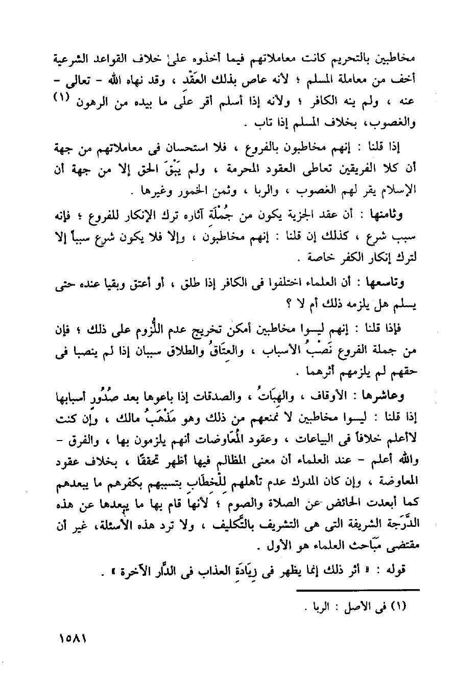 وثامنها: أن عقد الجزية يكون من جملة آثاره ترك الإنكار للفروع؛ فإنه سبب شرع، كذلك إن قلنا: إنهم مخاطبون، وإلا فلا يكون شرع سببا إلا لترك إنكار الكفر خاصة.