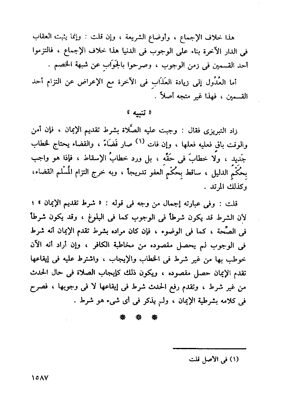 قلت: وفي عبارته إجمال من وجه في قوله: " شرط تقديم الإيمان "؛ لأن الشرط قد يكون شرطا في الوجوب كما في البلوغ، وقد يكون شرطا في الصحة، كما في الوضوء، فإن كان مراده بشرط تقدم الإيمان أنه شرط في الوجوب لم يحصل مقصوده من مخاطبة الكافر، وإن أراد أنه الآن خوطب بها من غير شرط في الخطاب والإيجاب، واشترط عليه في إيقاعها تقدم الإيمان حصل مقصوده ويكون ذلك كإيجاب الصلاة في حال الحدث من غير شرط، وتقدم رفع الحدث شرط في إيقاعها لا في وجوبها، فصرح في كلامه بشرطية الإيمان، ولم يذكر في أي شيء هو شرط.