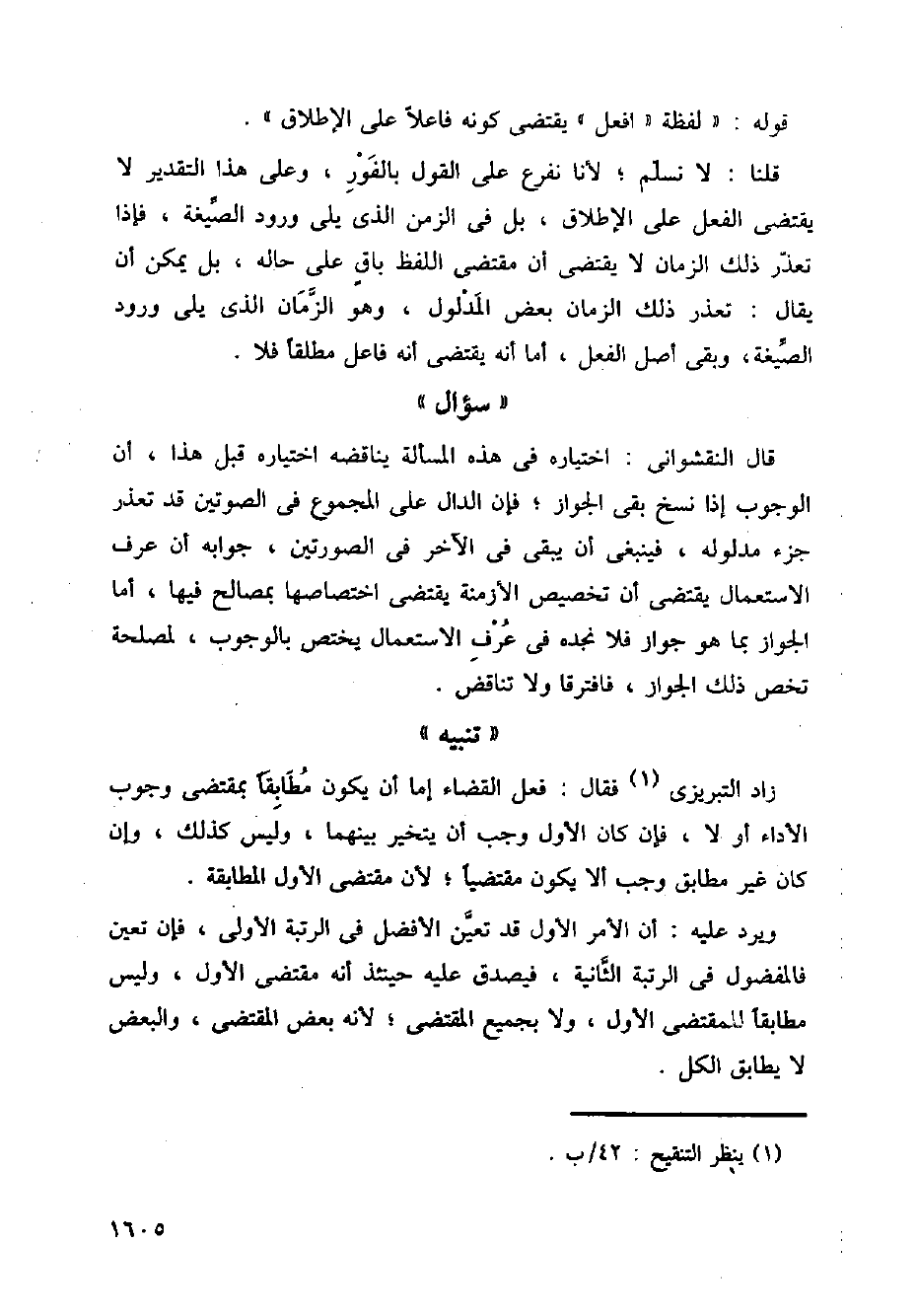 قال النقشواني: اختياره في هذه المسألة يناقضه اختياره قبل هذا، أن الوجوب إذا نسخ بقي الجواز؛ فإن الدال على المجموع في الصورتين قد تعذر جزء مدلوله، فينبغي أن يبقى في الآخر في الصورتين، جوابه أن عرف الاستعمال يقتضي أن تخصيص الأزمنة يقتضي اختصاصها بمصالح فيها، أما الجواز بما هو جواز فلا نجده في عرف الاستعمال يختص بالوجوب، لمصلحة تخص ذلك الجواز، فافترقا ولا تناقض.