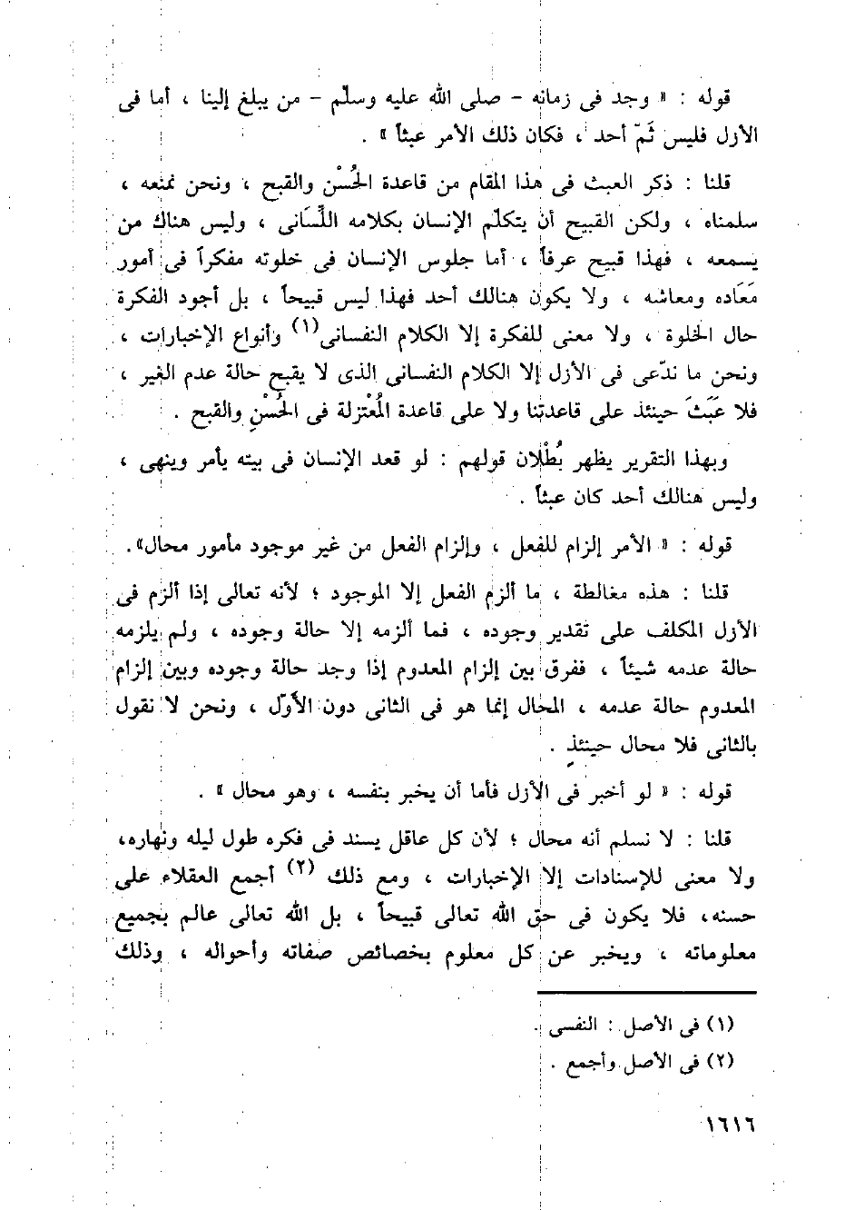 قلنا: ذكر العبث في هذا المقام من قاعدة الحسن والقبح، ونحن نمنعه، سلمناه، ولكن القبيح أن يتكلم الإنسان بكلامه اللساني، وليس هناك من يسمعه، فهذا قبيح عرفا، أما جلوس الإنسان في خلوته مفكرا في أمر معاده ومعاشه، ولا يكون هنالك أحد فهذا ليس قبحا، بل أجود الفكرة حال الخلوة، ولا معنى للفكرة إلا الكلام النفساني وأنواع الإخبارات، ونحن ما ندعي في الأزل إلا الكلام النفساني الذي لا يقبح حالة عدم الغير، فلا عبث حينئذ على قاعدتنا ولا على قاعدة المعتزلة في الحسن والقبح.