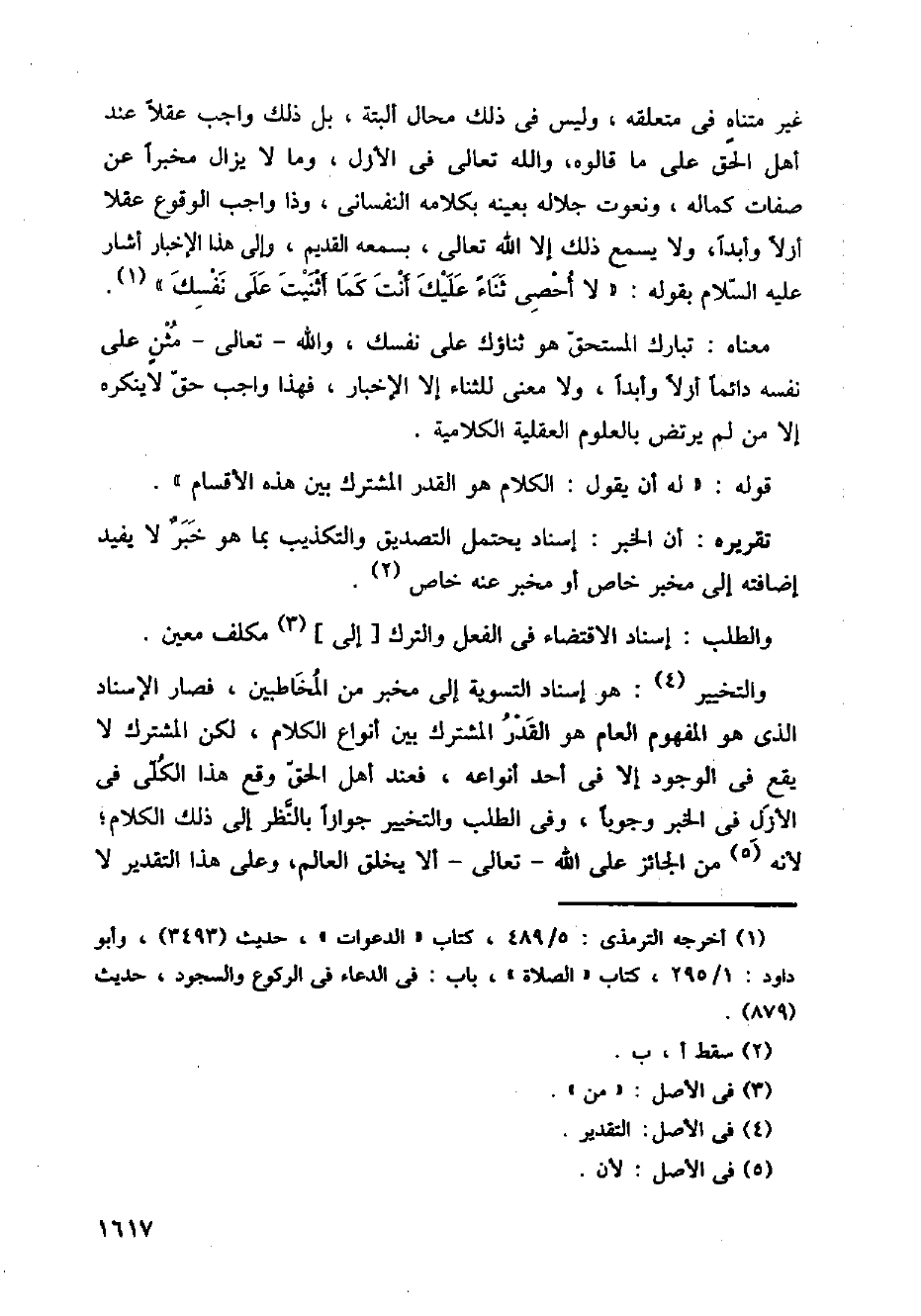 غير متناه في متعلقه، وليس في ذلك محال البتة، بل ذلك واجب عقلا عند أهل الحق على ما قالوه، والله تعالى في الأزل، وما لا يزال مخبرا عن صفات كماله، ونعوت جلاله بعينه بكلامه النفساني، وذا واجب الوقوع عقلا أزلا وأبدا، ولا يسمع ذلك إلا الله تعالى، بسمعه القديم، وإلى هذا الإخبار أشار عليه السلام بقوله: (لا أحصي ثناء عليك أنت كما أثنيت على نفسك).