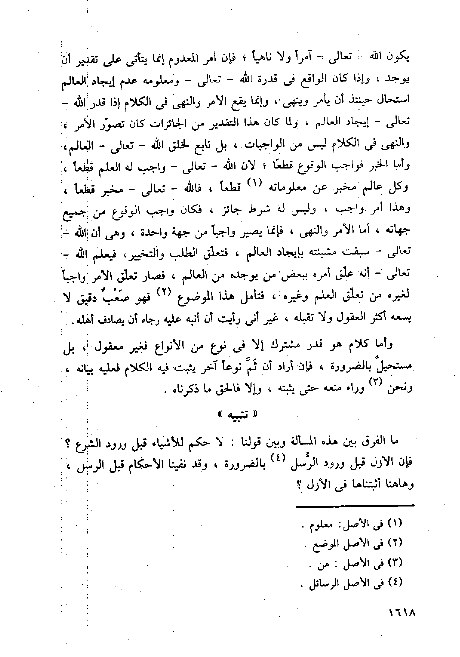 يكون الله تعالى آمرا ولا ناهيا؛ فإن أمر المعدوم إنما يأتي على تقدير أن يوجد، وإذا كان الواقع في قدرة الله تعالى ومعلومه عدم إيجاد العالم استحال حينئذ أن يامر وينهى، وإنما يقع الأمر والنهي في الكلام إذا قدّر الله تعالى إيجاد العالم، ولما كان هذا التقدير من الجائزات كان تصور الأمر، والنهي في الكلام ليس من الواجبات، بل تابع لخلق الله تعالى العالم، وأما الخبر فواجب الوقوع قطعا؛ لأن الله تعالى واجب له العلم قطعا، وكل عالم مخبر عن معلوماته قطعا، فالله تعالى مخبر قطعا، وهذا أمر واجب، وليس له شرط جائز، فكان واجب الوقوع من جميع جهاته، أما الأمر والنهي، فإنما يصير واجبا من جهة واحدة، وهي أن الله تعالى سبقت مشيئته بإيجاد العالم، فتعلق الطلب والتخيير، فيعلم الله تعالى أنه علق أمره ببعض من يوجده من العالم، فصار تعلق الأمر واجبا لغيره من تعلق العلم وغيره، فتأمل هذا الموضوع فهو صعب دقيق لا يسعه أكثر العقول ولا تقبله، غير أني رأيت أن أنبه عليه رجاء أن يصادف أهله.