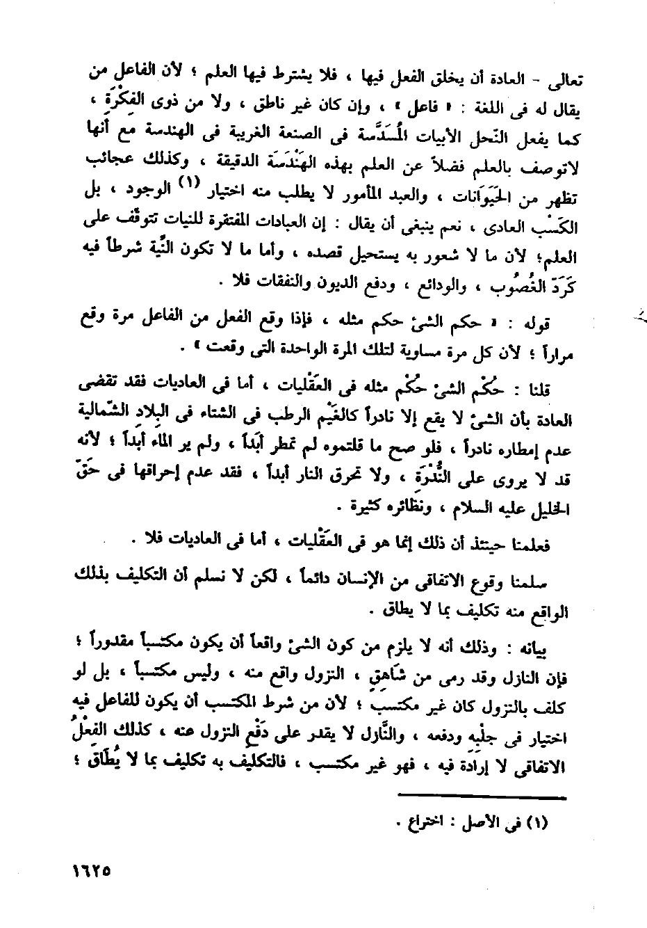 تعالى العادة أن يخلق الفعل فيها، فلا يشترط فيها العلم؛ لأن الفاعل من يقال له في اللغة: (فاعل)، وإن كان غير ناطق، ولا من ذوي الفكرة، كما يفعل النحل الأبيات المسدسة في الصنعة الغريبة في الهندسة مع أنها لاتوصف بالعلم فضلا عن العلم بهذه الهندسة الدقيقة، وكذلك عجائب تظهر من الحيوانات، والعبد المأمور لا يطلب منه اختيار الوجود، بل الكسب العادي، نعم ينبغي أن يقال: إن العبادات المفتقرة للنيات تتوقف على العلم؛ لأن ما لا شعور به يستحيل قصده، وأما ما لا تكون النية شرطا فيه كرد الغصوب، والودائع، ودفع الديون والنفقات فلا.