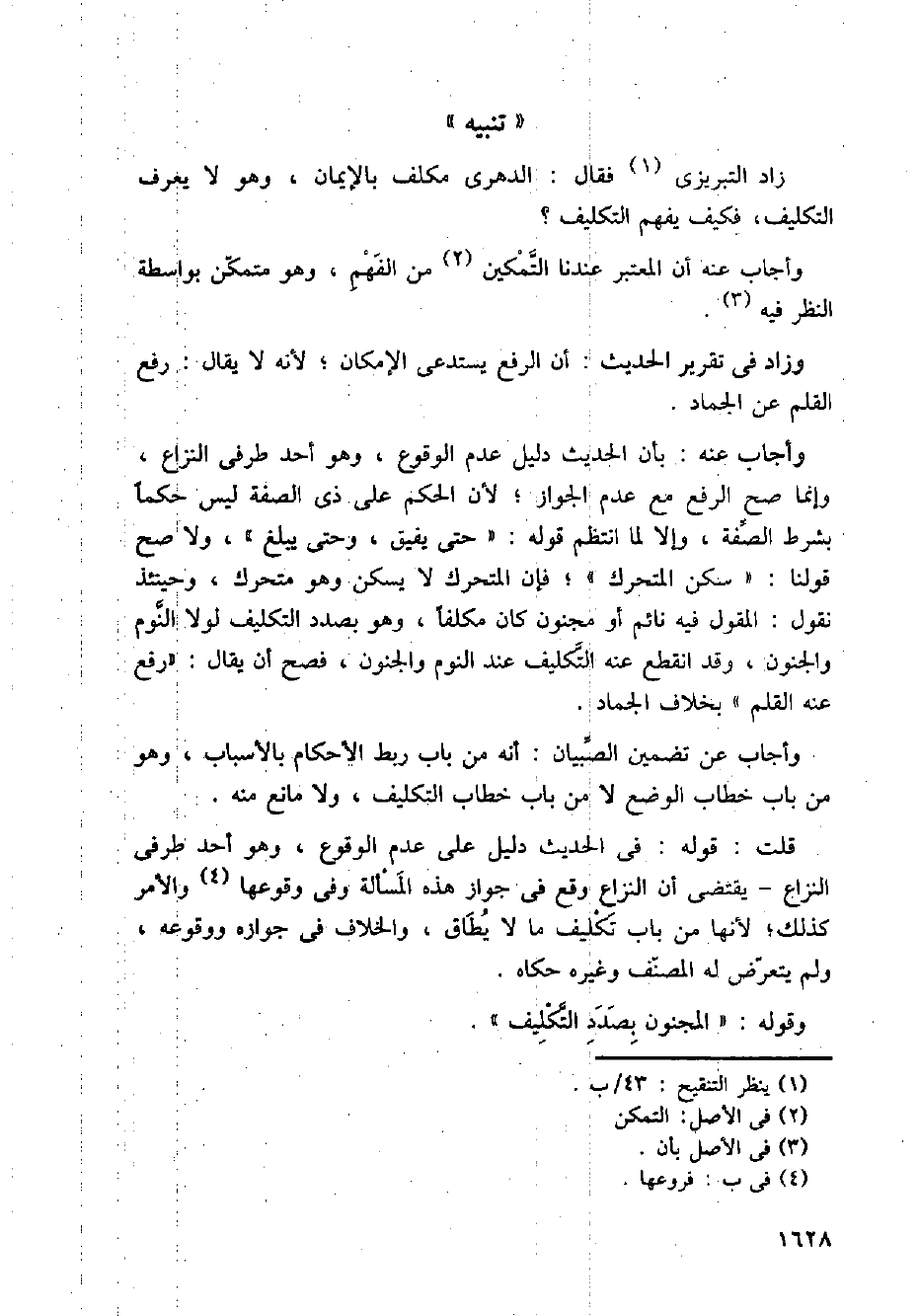 وأجاب عنه: بأن الحديث دليل عدم الوقوع، وهو أحد طرفي النزاع، وإنما صح الرفع مع عدم الجواز؛ لأن الحكم على ذي الصفة ليس حكما بشرط الصفة، وإلا لما انتظم قوله: " حتى يفيق، وحتى يبلغ "، ولا صح قولنا: " سكن المتحرك "؛ فإن المتحرك لا يسكن وهو متحرك، وحينئذ نقول: المقول فيه نائم أو مجنون كان مكلفا، وهو بصدد التكليف لولا النوم والجنون، وقد انقطع عنه التكليف عند النوم والجنون، فصح أن يقال: " رفع عنه القلم " بخلاف الجماد.