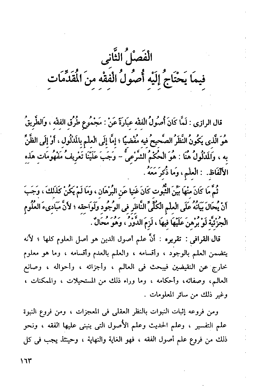 قال القرافي: تقريره: أن علم أصول الدين هو أصل العلوم كلها؛ لأنه يتضمن العلم بالوجود، وأقسامه، والعلم بالعدم وأقسامه، والعلم بالعدم وأقسامه، وما هو معلوم خارج عن النقيضين فيبحث في العالم، وأجزائه، وأحواله، وصانع العالم، وصفاته، وأحكامه، وما وراء ذلك من المستحيلات، والممكنات، وغير ذلك من سائر المعلومات.