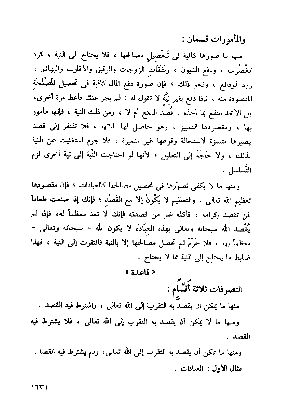منها ما صورها كافية في تحصيل مصالحها، فلا يحتاج إلى النية، كرد الغصوب، ودفع الديون، ونفقات الزوجات والرقيق والأقارب والبهائم، ورد الودائع، ونحو ذلك؛ فإن صورة دفع المال كافية في تحصيل المصلحة المقصودة منه، فإذا دفع بغير نية لا نقول له: لم يجز عنك فأعط مرة أخرى، بل الآخذ انتفع بما أخذه، قصد الدفع أم لا، ومن ذلك النية، فإنها مأمور بها، ومقصودها التمييز، وهو حاصل لها لذاتها، فلا تفتقر إلى قصد يصيرها متميزة لاستحالة وقوعها غير متميزة، فلا جرم استغنيت عن النية لذلك، ولا حاجة إلى التعليل؛ لأنها لو احتاجت النية إلى نية أخرى لزم التسلسل.
