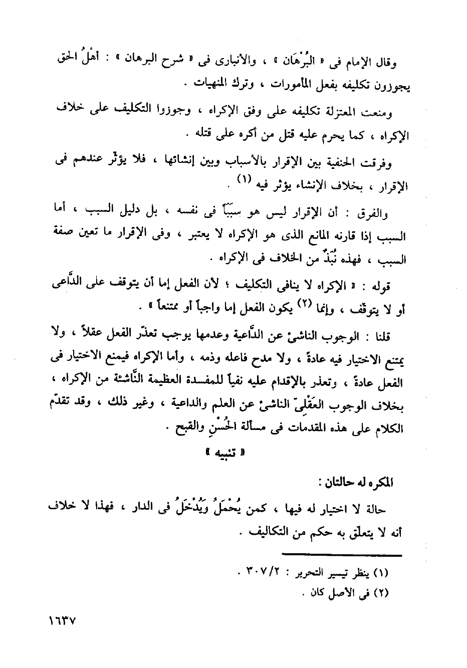 قوله: " الإكراه لا ينافي التكليف؛ لأن الفعل إما أن يتوقف على الداعي أو لا يتوقف، وإنما يكون الفعل إما واجبا او ممتنعا ".
