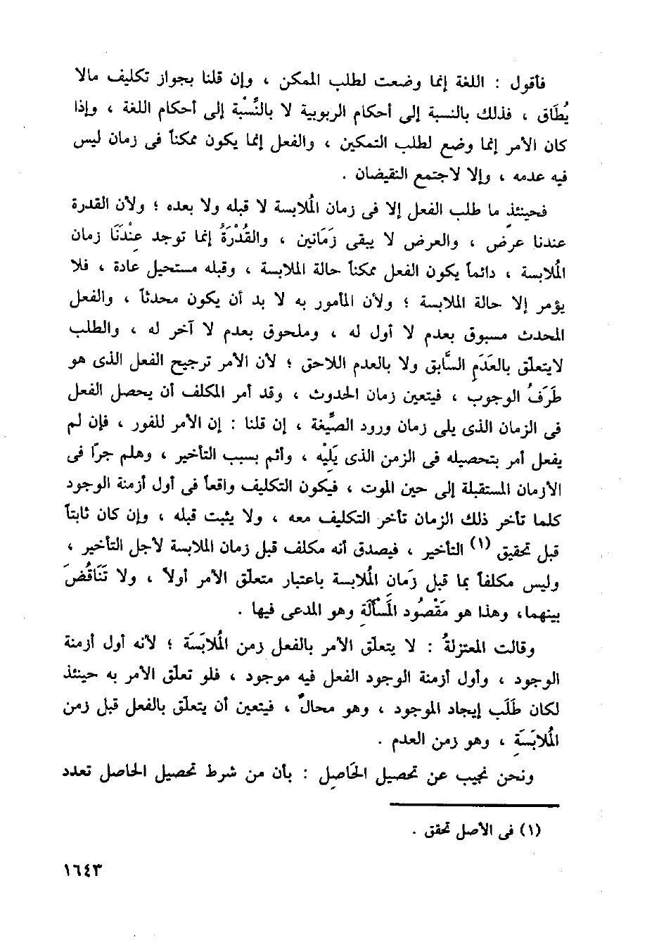 فأقول: اللغة إنما وضعت لطلب الممكن، وإن قلنا بجواز تكليف مالا يطاق، فذلك بالنسبة إلى أحكام الربوبية لا بالنسبة إلى أحكام اللغة، وإذا كان الأمر إنما وضع لطلب التمكين، والفعل إنما يكون ممكنا في زمان ليس في عدمه، وإلا لاجتمع النقيضان.