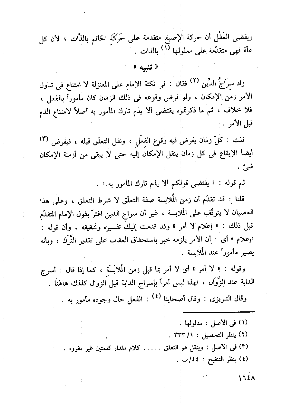 زاد سراج الدين فقال: في نكتة الإمام على المعتزلة لا امتناع في تناول الأمر زمن الإمكان، ولو فرض وقوعه في ذلك الزمان كان مأمورا بالفعل، فلا خلاف، ثم ما ذكرتموه يقتضي ألا يذم تارك المأمور به أصلا لامتناع الذم قبل الأمر.